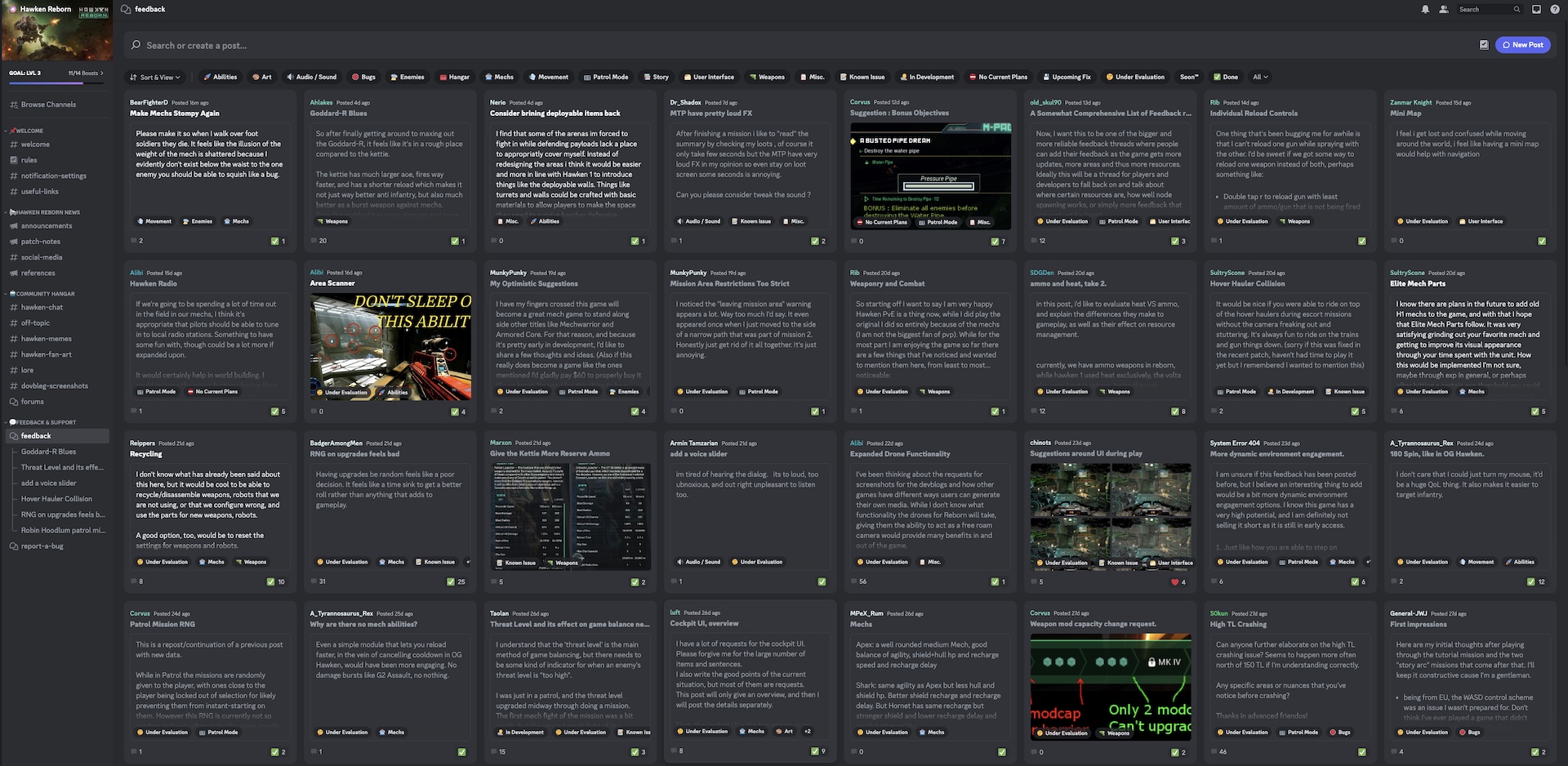 Our number one priority is engaging with all Hawken players and the amount of feedback that we’ve seen has been immense to say the least. We’ve seen the impassioned critical walls of #forumposting and just on our Discord Server alone, there are over 200+ feedback posts made by players. While we can’t comment on every single one, our community team has been working behind the scenes to flag them with our development team and have started to tag the feedback in our Discord Server to give players some visibility into how we’re sorting their posts.