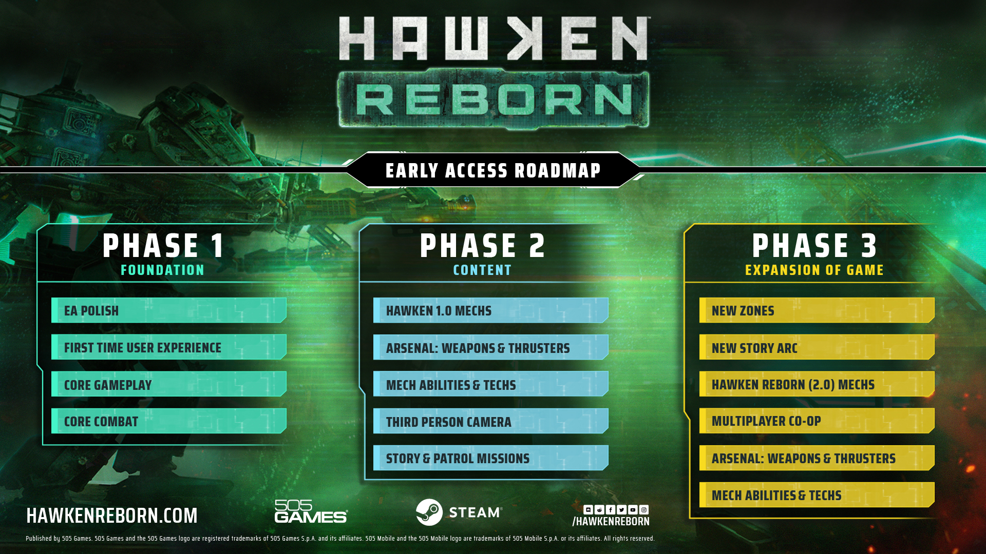 We’ll speak to our roadmap in greater detail in a follow-up blog post but know that 505 Games is supporting Hawken Reborn for a long time to come and are making sure not to rush things. As such, we’re moving at a pace that allows us to focus on delivering content when it’s ready, whilst adjusting and balancing pre-existing content at the same time. PHASE 1 is where we will really establish the gameplay and combat, so expect lots of tweaks and calls for feedback as we build the foundations of the game!